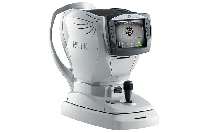 この検査は非接触で痛みのないやさしい検査で、屈折度数(近視・遠視・乱視の程度)や角膜形状(角膜のカーブ)を測定できます。